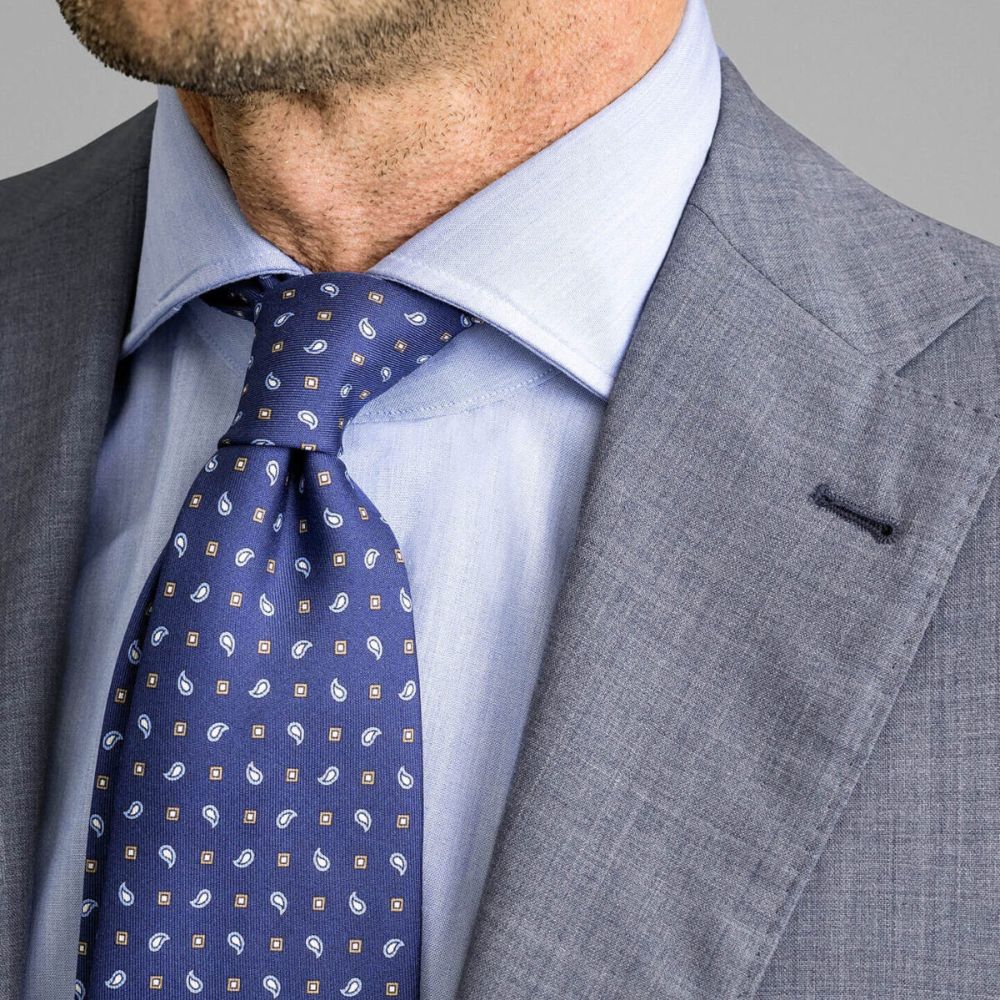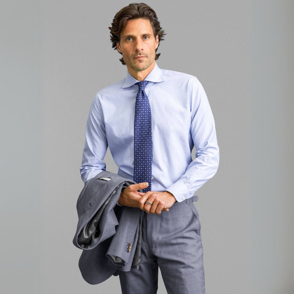 Este chambray de 2 capas de los años 75 está tejido en Italia a partir de un algodón suave y refinado. Esta tela tiene una hermosa variación de color y una textura increíble que la hace parecer tu chambray favorito, ya usado. El color azul más claro y la falta de tonos índigo hacen que parezca menos una tela tradicional o de ropa de trabajo que algunas de nuestras otras chambrays. De hecho, puede ser nuestra chambray más fácil de vestir. Se ve fantástica debajo de una chaqueta deportiva o incluso combinada con un traje o corbata, pero también se ve bien cuando se usa de manera más informal con un par de jeans. Definitivamente recomendamos optar por detalles suaves en todo el contorno para esta prenda. Para un estilo más informal, prueba nuestros cuellos abotonados o de banda Soft Ivy, y para un estilo italiano más elegante, prueba nuestros cuellos abiertos Soft Roma o Cutaway Soft Roma.