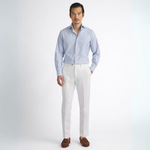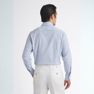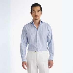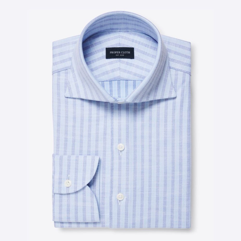 Este tejido de piqué, tejido exclusivamente para nosotros en Italia por la fábrica familiar Grandi & Rubinelli, es lo que los italianos llaman "nido d'ape" o "gofre de nido de abeja". Tiene una hermosa textura geométrica que, junto con su fino flameado, brillo sutil y suave caída, crea una camisa visualmente interesante y favorecedora. El acabado es increíblemente suave y, con la adición de elastano premium, este tejido fácil de llevar se vuelve aún más cómodo, perfecto tanto para un fin de semana en la playa como para usar durante todo el año. Esta brillante raya azul claro se transforma fácilmente entre ropa informal de negocios y ropa informal auténtica. Prueba a meterla dentro de unos pantalones de lino con alpargatas, o desabrocha un par de botones, ponte unos pantalones cortos y vete a la playa.