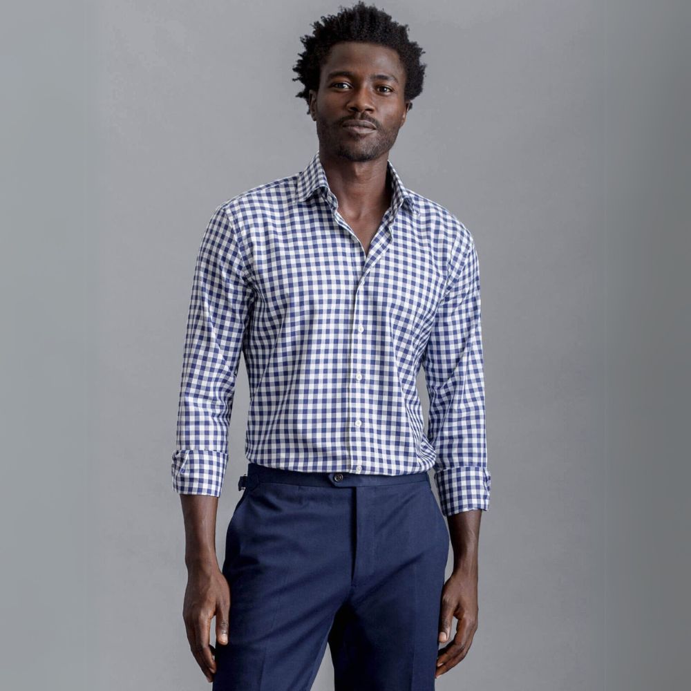 Nuestra popular calidad de sarga de Greenwich se teje en Europa con un número de hilos de dos capas de 100 para crear una tela resistente pero cómoda con un acabado notablemente sedoso. El tejido de sarga, que tiene un hermoso efecto de espiga, le da a esta tela una pizca de brillo para una apariencia más elegante y le permite una caída increíblemente buena. Este atemporal cuadro "gingham" azul marino es una opción versátil para un ambiente de negocios relajado. Ponte una chaqueta deportiva encima con unos chinos o úsalo con el cuello abierto con un traje para un look elegante que es un poco más divertido.