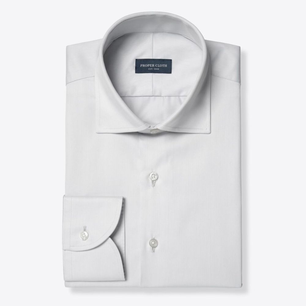 Nuestra popular calidad de sarga de Greenwich se teje en Europa con un número de hilos de dos capas de 100 para crear una tela resistente pero cómoda con un acabado notablemente sedoso. El tejido de sarga le da a esta tela una pizca de brillo para una apariencia más elegante y permite que cubra increíblemente bien. Nos encanta la sutileza de este tono de gris más claro: es lo suficientemente versátil como para usarlo en lugar de una camisa blanca o azul claro, pero también se ve muy bien como parte de un look gris tonal. Combínalo con un clásico traje gris carbón y mocasines.