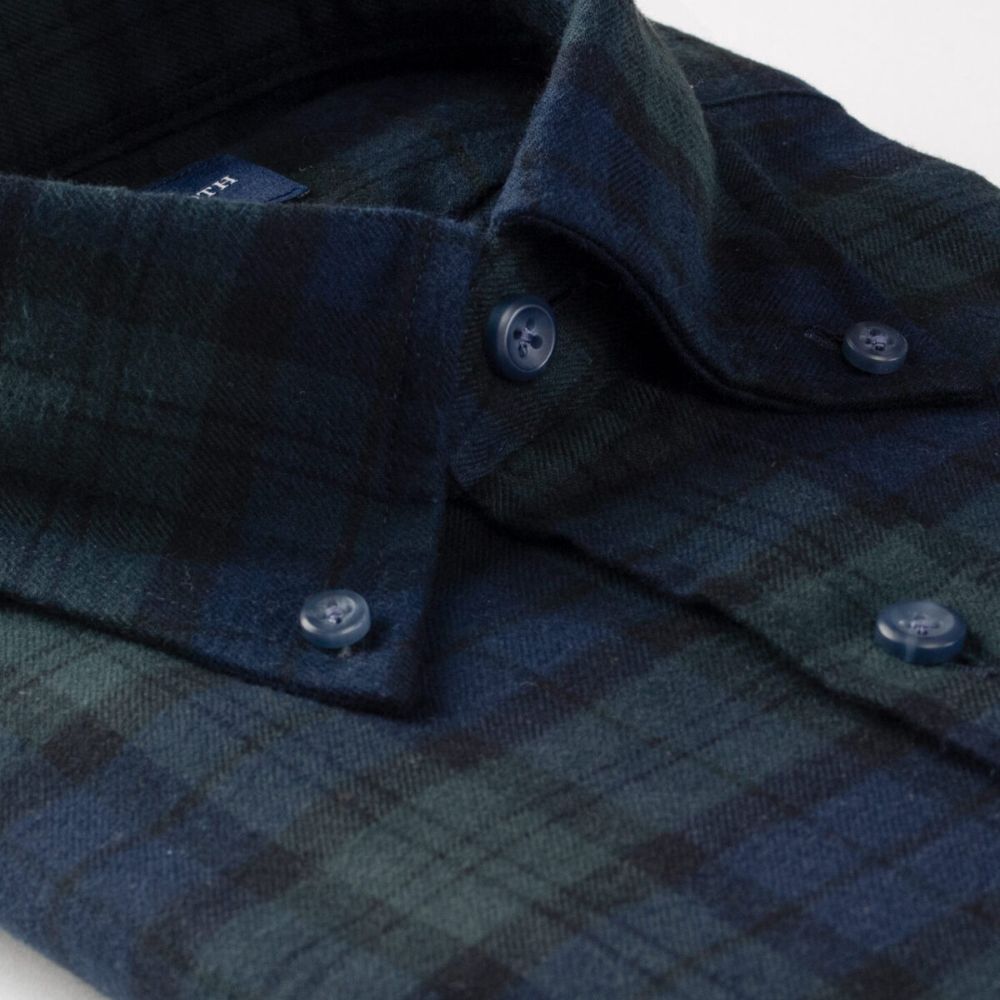 Tejida en Japón y confeccionada con un pronunciado tejido de sarga de una sola capa de los años 30, esta franela de algodón suave y gruesa te mantendrá súper abrigado sin que te sobrecalientes. El patrón de cuadros Black Watch se originó en los regimientos militares británicos de las Tierras Altas de Escocia alrededor de 1725 y desde entonces ha permeado la industria de la moda masculina como un motivo clásico y versátil. Se ha sugerido que el nombre “Black Watch” deriva en parte de la oscuridad de los azules y verdes del cuadro (desde lejos la combinación puede parecer casi negra) y este está a la altura de eso. El azul marino intenso y el verde bosque juegan en un diseño detallado a cuadros que nunca pasará de moda.