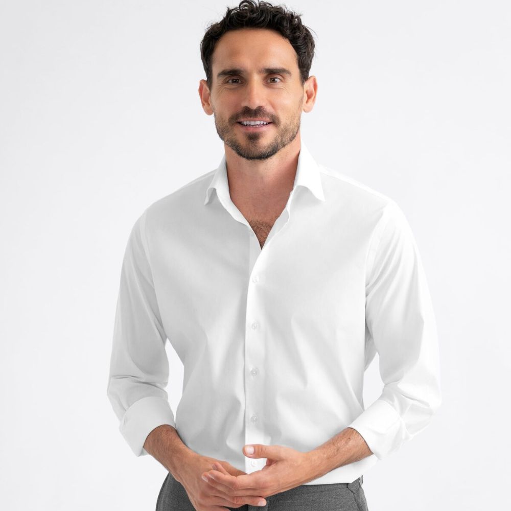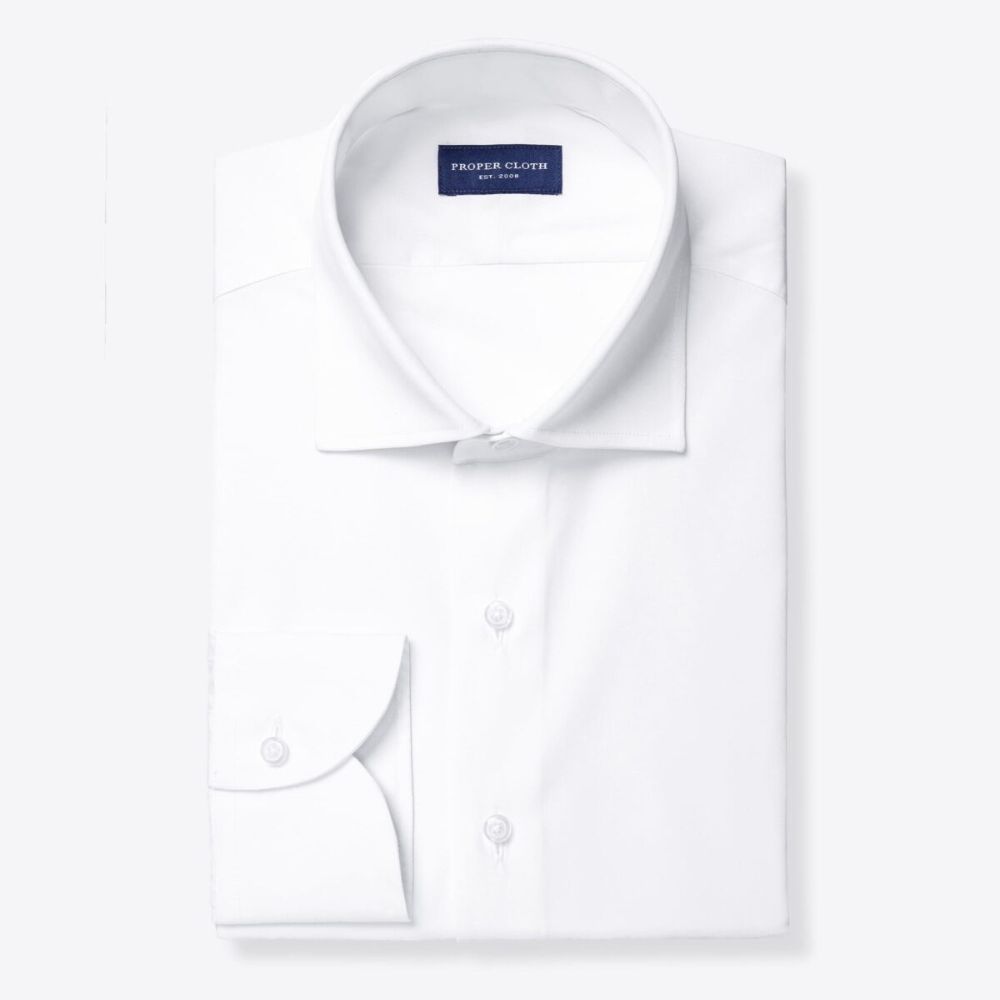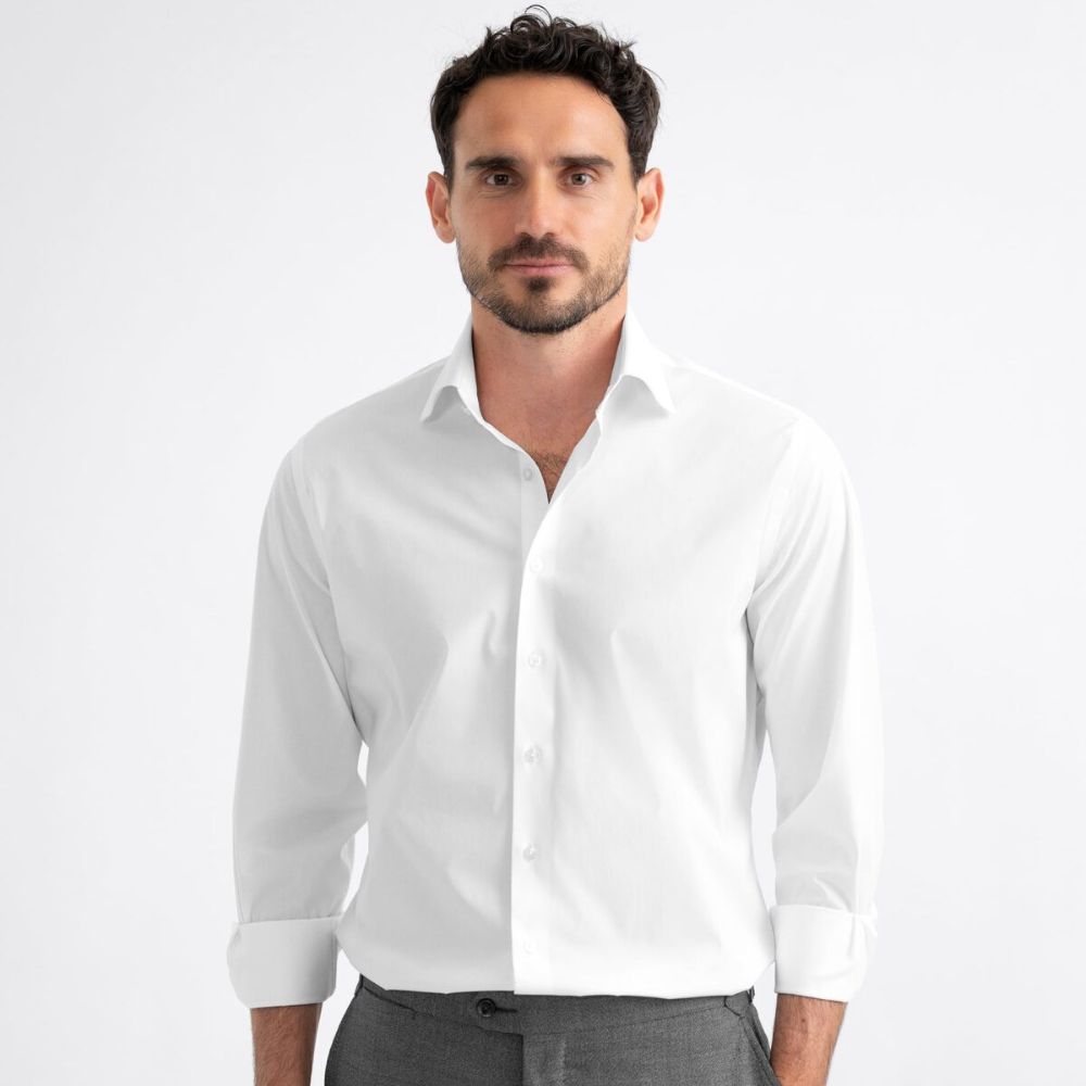 Está tejido solo para nosotros utilizando una construcción de 2 capas de 120s tanto en la urdimbre como en la trama, lo que le permite resistir mejor con el tiempo que la mayoría de las telas ligeras y suaves de este estilo. Nos encantan los paños como este por lo limpios que se ven: es un tejido sencillo simple y elegante sin textura alguna. Esto le da ese atractivo fresco y urbano cuando está planchado o puede usarlo más relajado si decide dejar que las arrugas se vean. Si prefiere una camisa blanca opaca o especialmente resistente a las arrugas, le sugerimos que elija una sarga blanca como nuestra sarga Hudson. Esta es una de nuestras camisas de vestir blancas menos opacas.