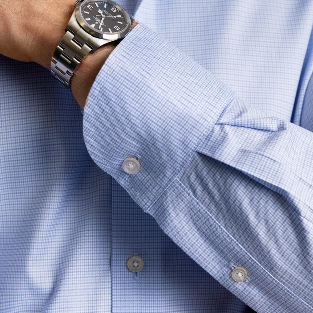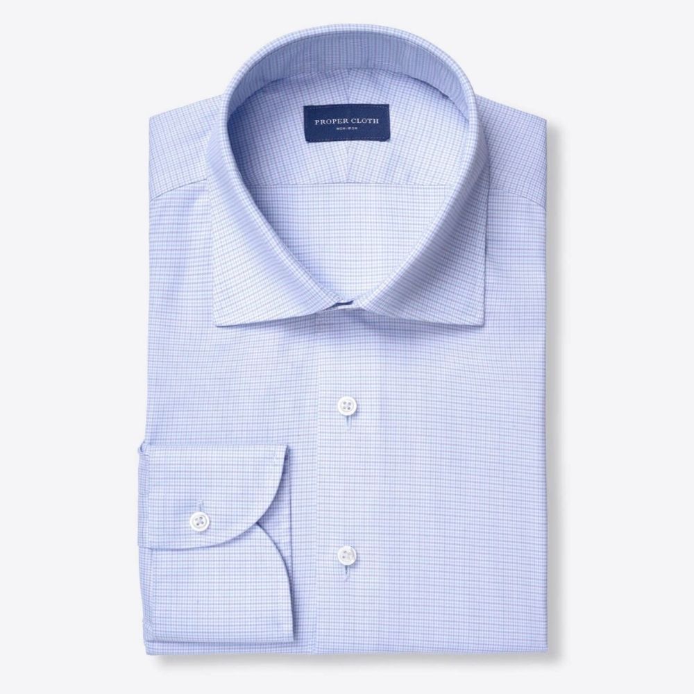 Esta hermosa mezcla de algodón de dos capas 100s y elastano de alto rendimiento es suave y súper cómoda. El alto contenido de algodón significa que se siente exactamente como el algodón normal, incluso con elastano; solo tiene un poco más de dar cuando lo necesitas. Todas nuestras telas que no requieren plancha están terminadas con un innovador tratamiento bajo en formaldehído (low-formaldehyde treatment) que les permite permanecer sin arrugas todo el día mientras se usan cómodamente contra la piel. Este refinado cuadro lavanda y azul claro se vuelve aún más interesante por el patrón de "houndstooth", que le agrega otra capa de dimensión. Es una excelente opción para looks informales de negocios y de negocios sencillos, aunque nos gusta más cuando está arreglado. Pruébalo con un traje azul marino o con unos chinos el fin de semana.