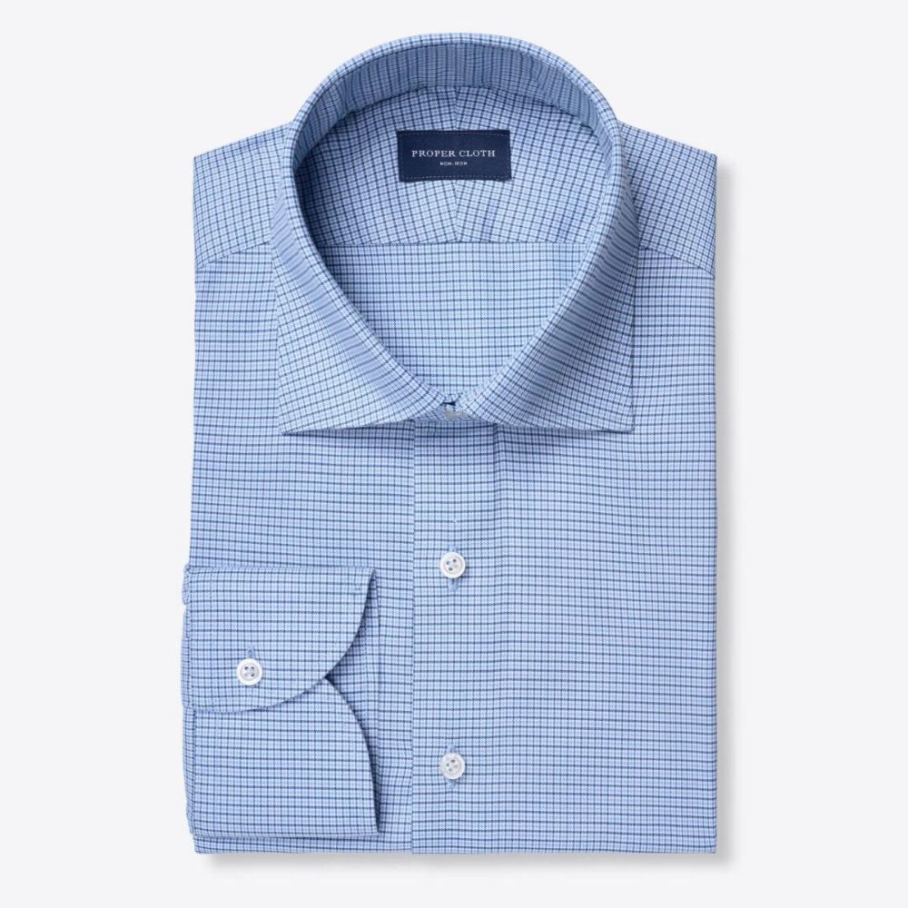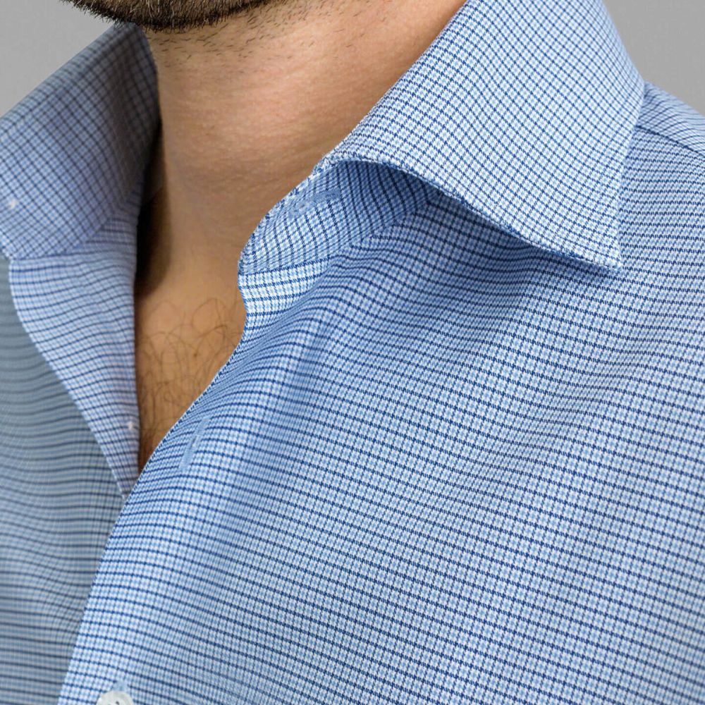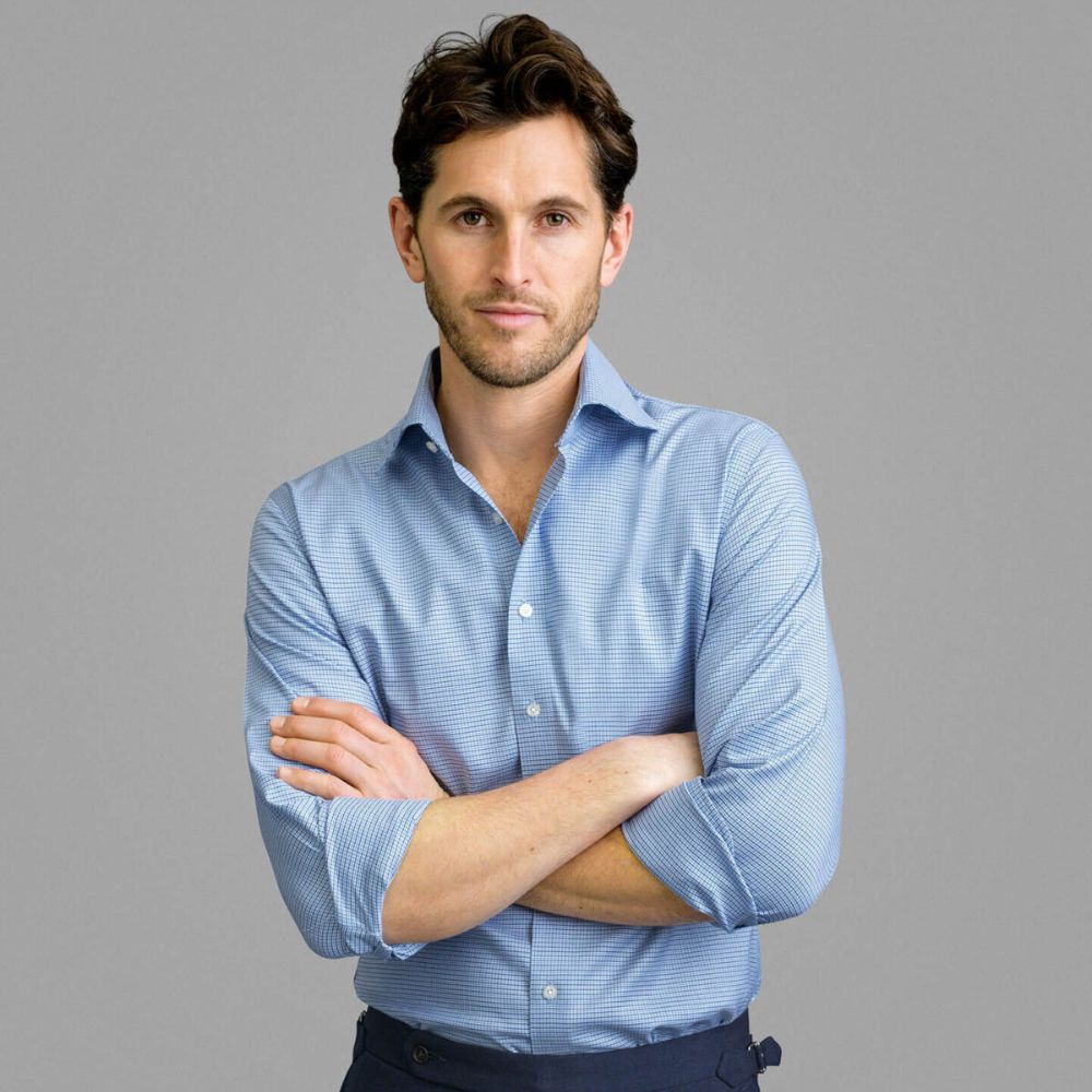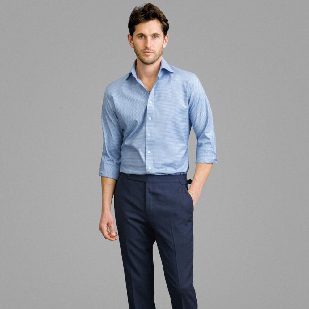 Esta hermosa mezcla de algodón de dos capas 100s y elastano de alto rendimiento es suave y súper cómoda. El alto contenido de algodón significa que se siente exactamente como el algodón normal, incluso con elastano; solo tiene un poco más de dar cuando lo necesitas. Todas nuestras telas que no requieren plancha están terminadas con un innovador tratamiento bajo en formaldehído (low-formaldehyde treatment) que les permite permanecer sin arrugas todo el día mientras se usan cómodamente contra la piel. Este refinado cuadro azul se vuelve aún más interesante por el patrón de "houndstooth", que le agrega otra capa de dimensión. Es una excelente opción para looks informales de negocios y de negocios sencillos, aunque nos gusta más cuando está arreglado. Pruébalo con un traje azul marino o con unos chinos el fin de semana.