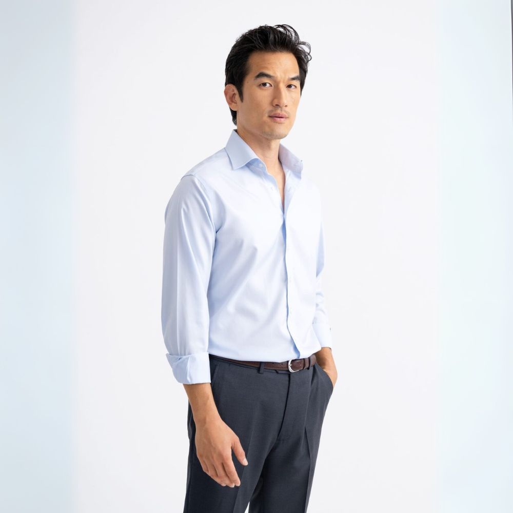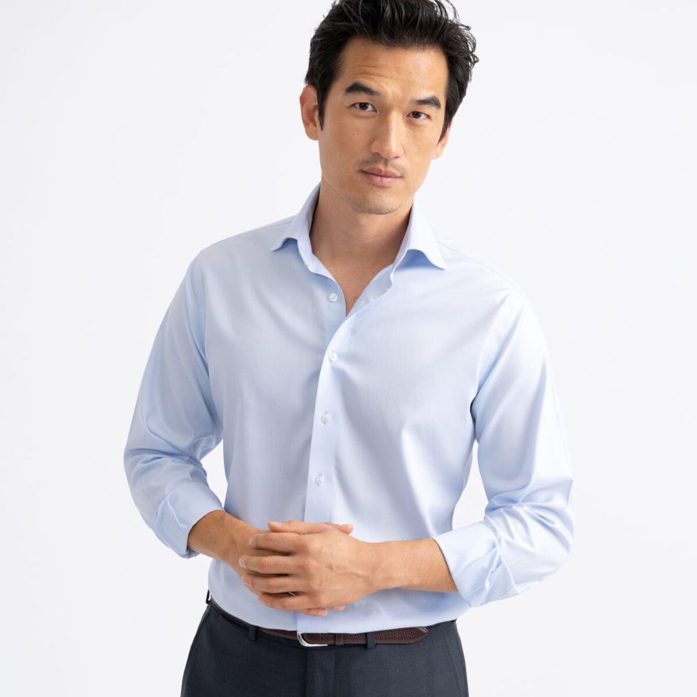 Nuestras telas elásticas que no requieren plancha están hechas de una mezcla premium de algodón Supima americano de dos capas 100s y un pequeño porcentaje de spandex de alto rendimiento. Tienen la cantidad justa de elasticidad para moverse contigo cómodamente durante el uso diario. Todas nuestras telas que no requieren plancha están terminadas con un innovador tratamiento "formaldehyde-free" que les permite permanecer sin arrugas todo el día mientras se usan cómodamente contra la piel. Este clásico sarga azul claro es un elemento básico del guardarropa, perfecto para todo, desde entrevistas hasta bodas. Combínalo con un clásico traje azul marino o un pantalón de vestir gris.