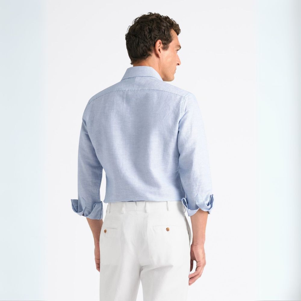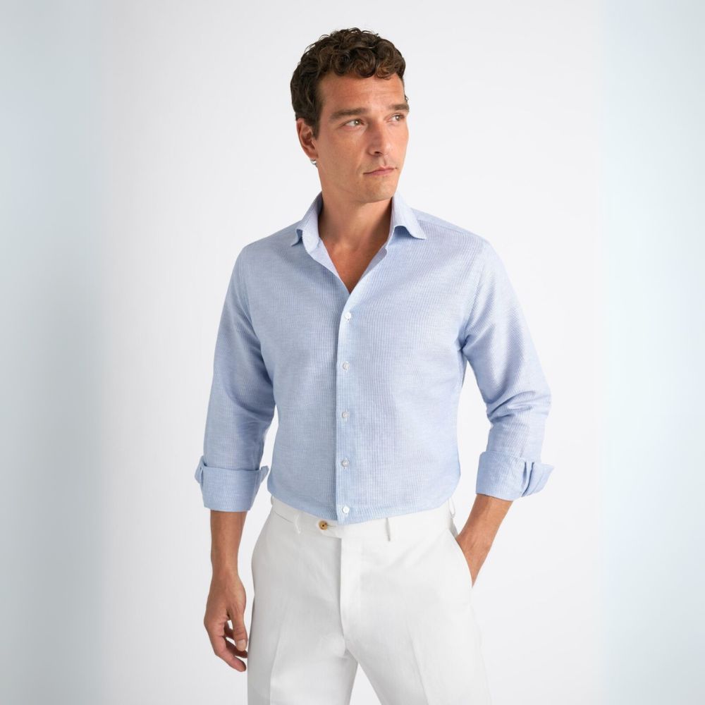 Esta mezcla portuguesa de algodón y lino ofrece la suavidad del algodón y la transpirabilidad del lino. No es tan irregular como el lino puro, aunque su tejido oxford le aporta un toque de textura a su acabado seco y fresco. Hemos comprobado que nuestras camisas de mezcla de lino mejoran con el uso, así que seguro que te encantarán aún más con el tiempo. Es una tela excelente para una camisa de vestir de verano: combínala con pantalones de vestir de lino o algodón, alpargatas o mocasines para un look elegante y relajado.