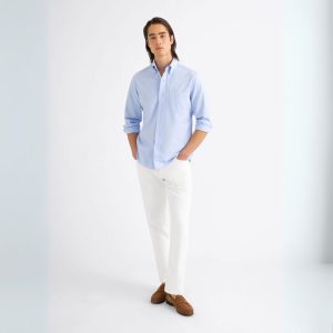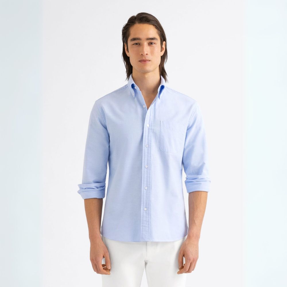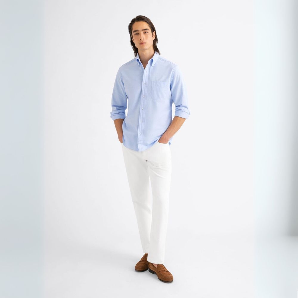 Tejido por la portuguesa Somelos con una densidad de hilos de una sola capa de 40 hilos, este oxford está hecho para la comodidad. Es una excelente opción para quienes aman nuestros clásicos oxfords pesados pero buscan algo un poco más ligero y transpirable, especialmente en los meses más cálidos del año. Además, recibe un lavado especial para darle un tacto suave y cómodo desde el primer día. Un oxford azul claro como este es imprescindible en cualquier armario; llévalo con vaqueros, chinos o pantalones de vestir con tachuelas, y mocasines o zapatillas deportivas.