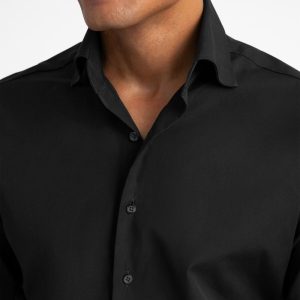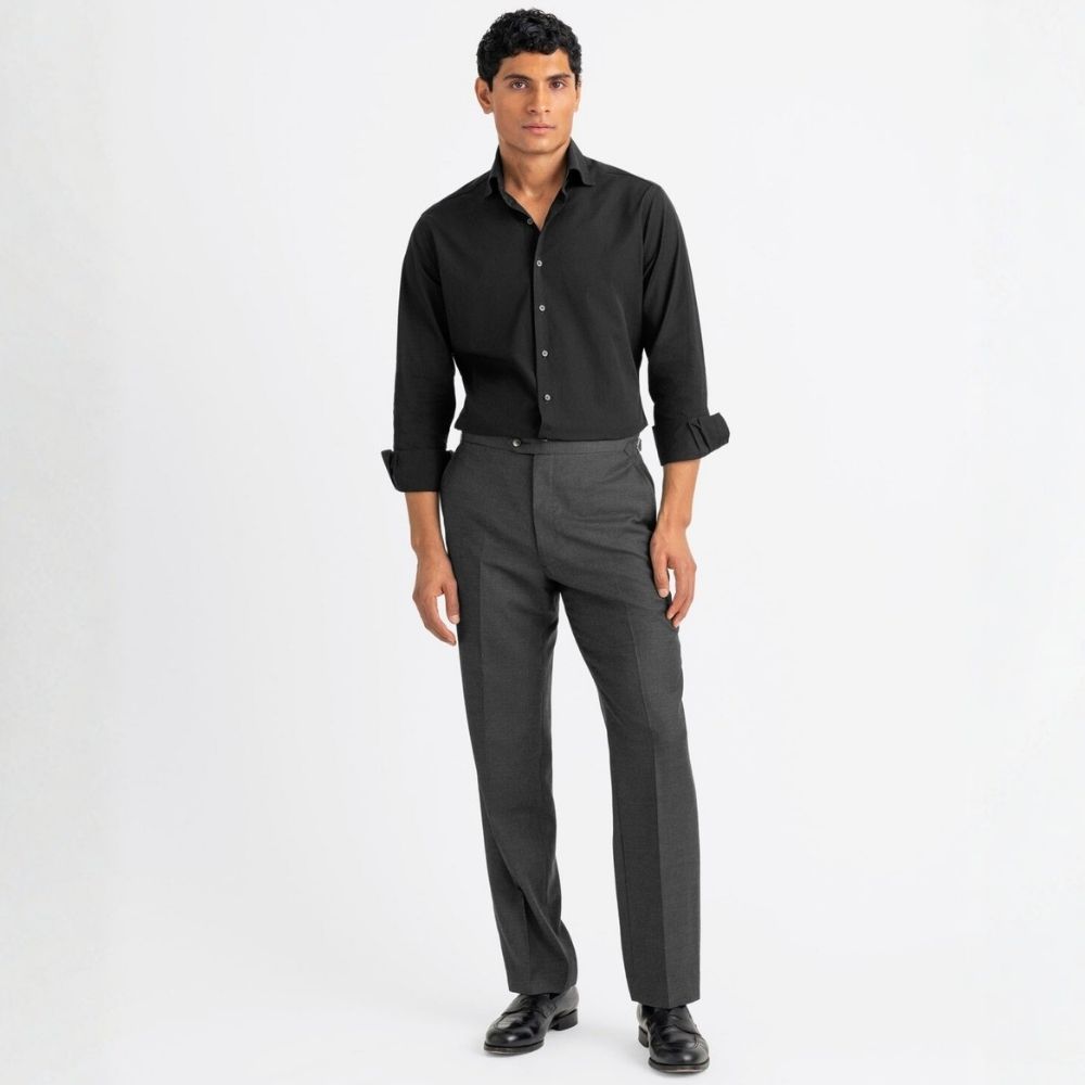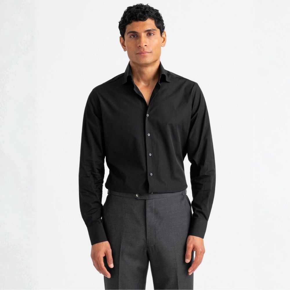 La confección de doble capa de 120 hilos de este paño fino, suave y sedoso, combina a la perfección ligereza y frescura. Los paños finos tienen el grosor perfecto para usar durante todo el año y su textura es mínima o nula, lo que les confiere una apariencia impecable y una gran versatilidad. Su ligereza los hace más propensos a arrugarse que las sargas o las telas de punto; sin embargo, se planchan con facilidad e incluso se pueden lavar sin planchar para un look más informal. Este clásico negro tiene numerosas aplicaciones, desde el estilo ejecutivo hasta el formal e informal. Combínalo con un traje negro o un pantalón chino gris y mocasines negros.