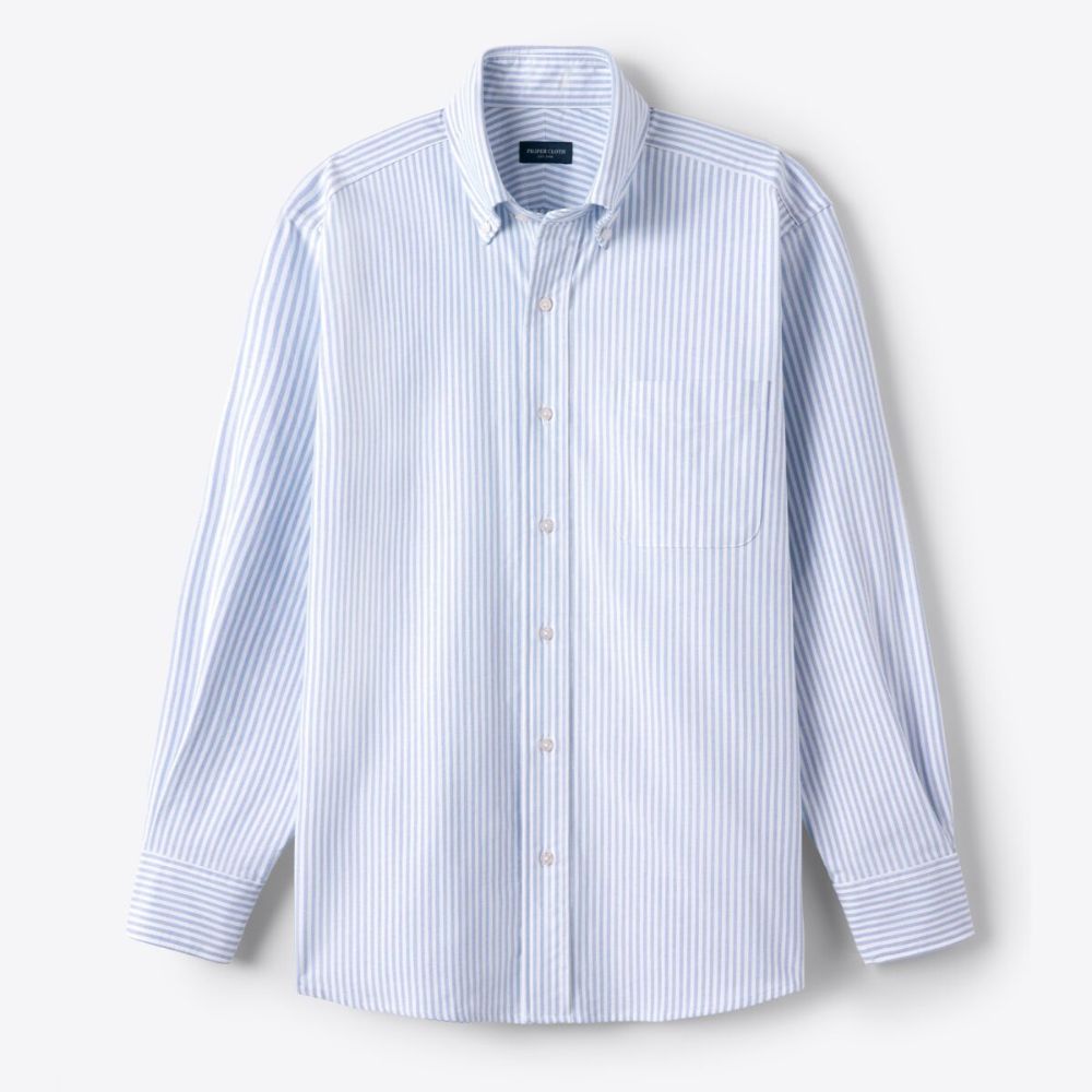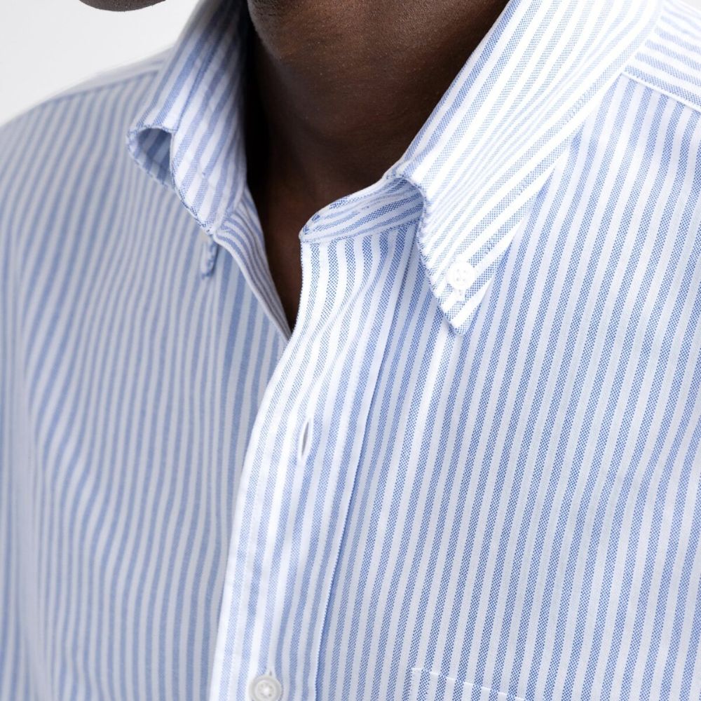 Nuestros pesados oxford tienen la cantidad justa de peso: están tejidos con algodón Pima con una construcción de 2 capas de los años 40 para una tela que se siente sólida, pero no demasiado gruesa. También son muy resistentes, lo que significa que durarán años y solo mejorarán cuanto más se laven y usen. Puedes vestir un oxford debajo de una chaqueta deportiva o vestirlo con tus jeans favoritos. Es una de las pocas telas que se puede usar tan fácilmente con una corbata como arrugada y desabrochada. Este oxford grueso con rayas universitarias azules es atemporal y fácil de usar.