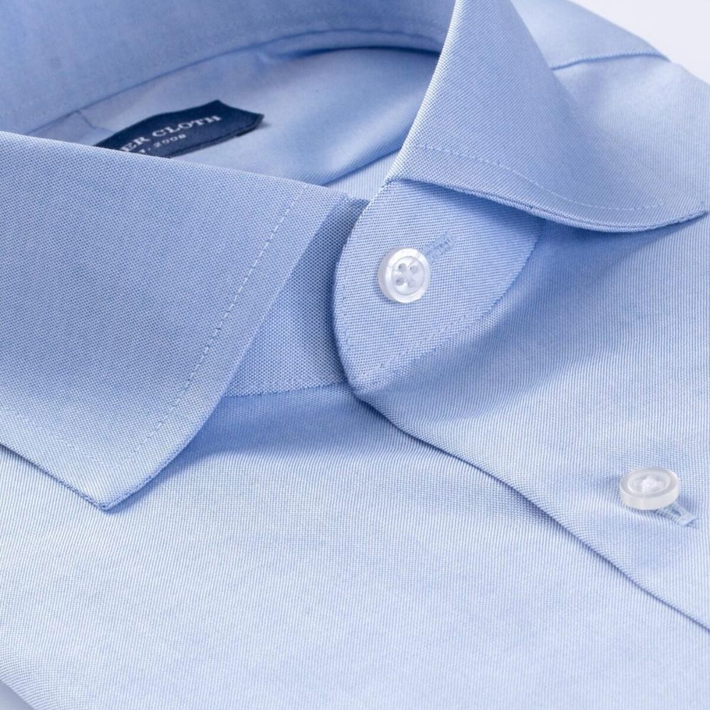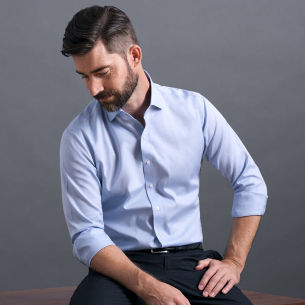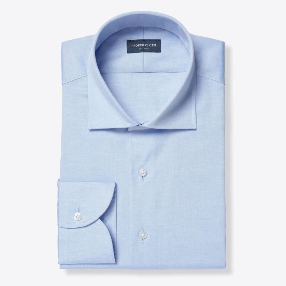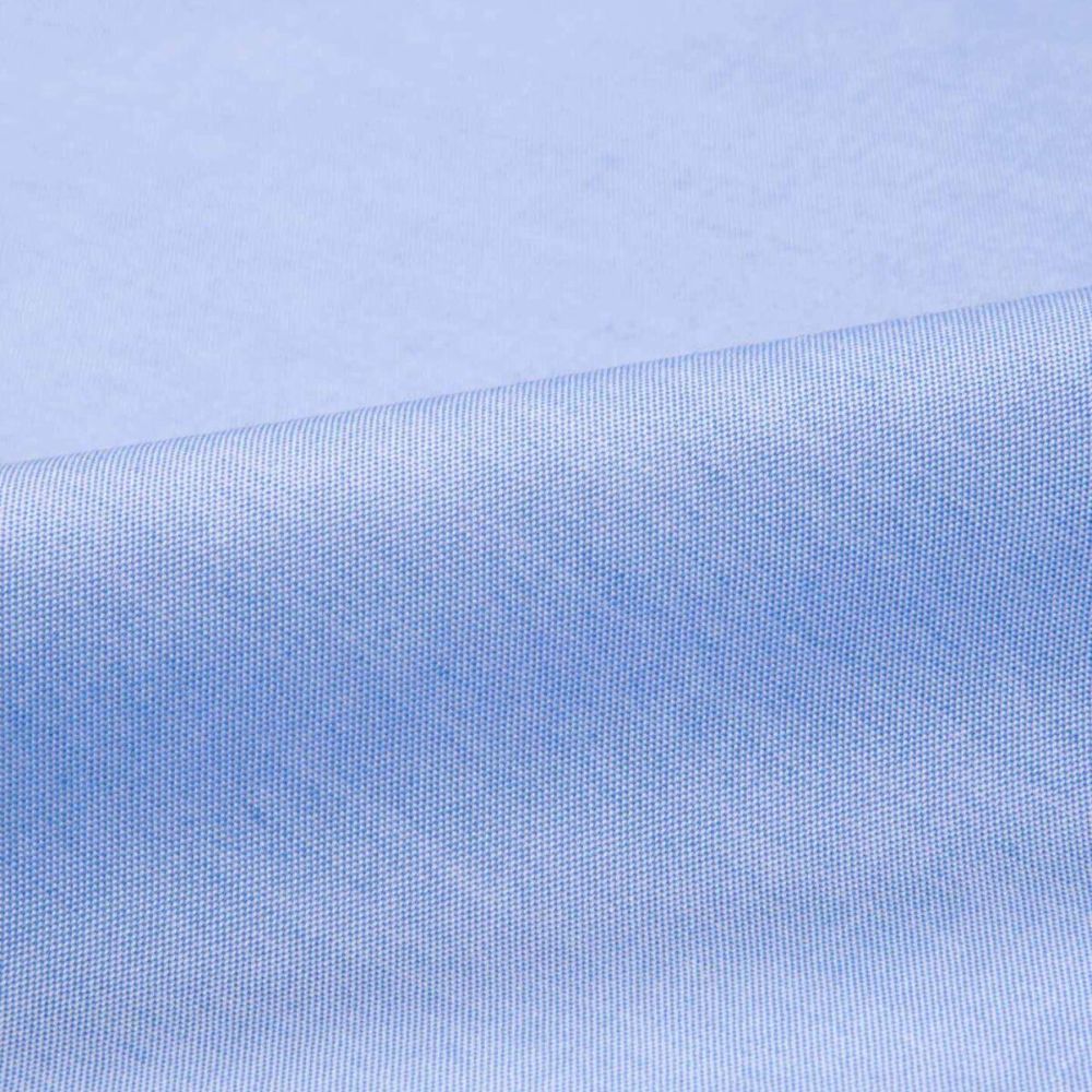 Una camisa de vestir azul "workhorse" con una textura versátil.